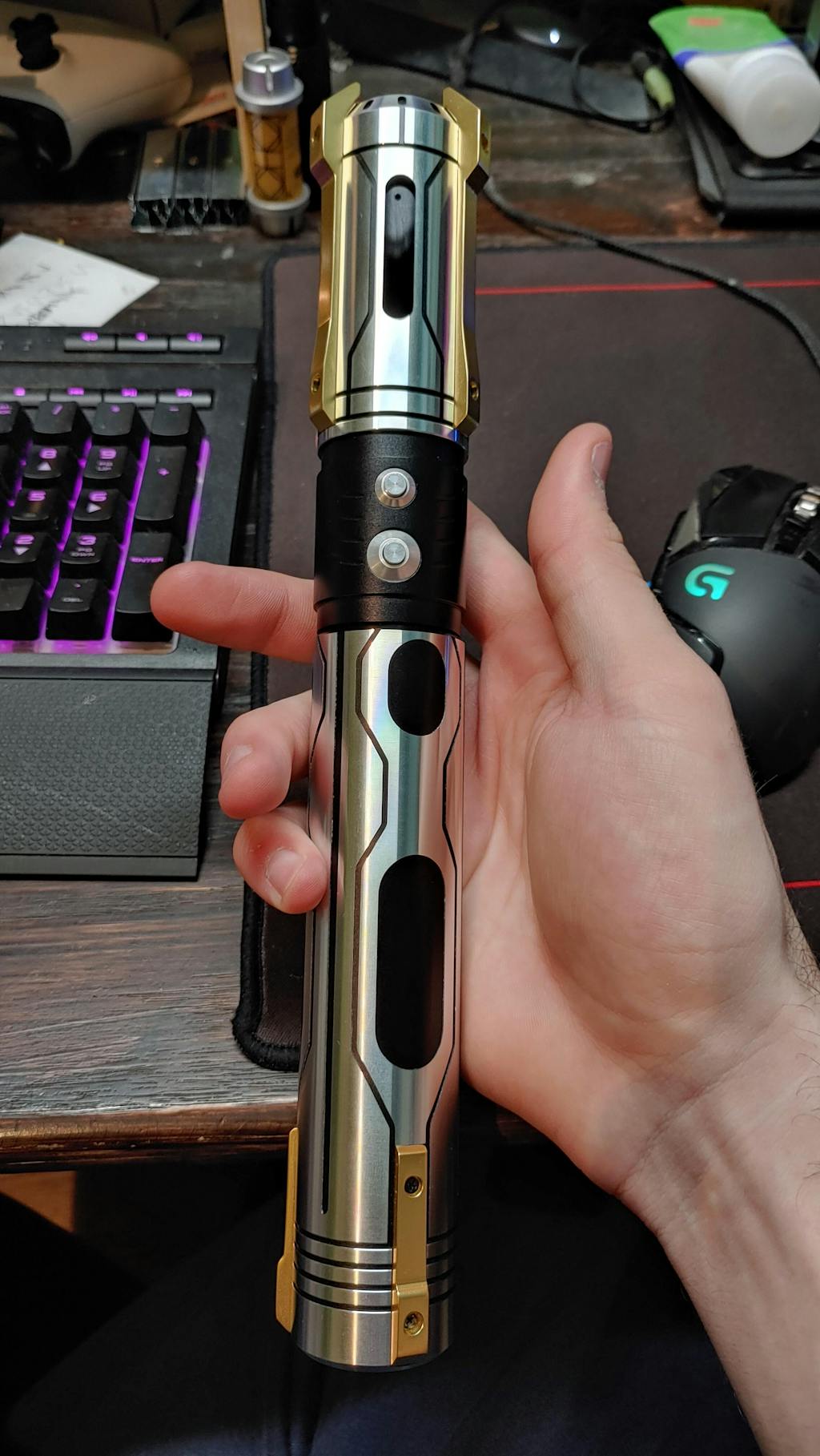 Our new GHOST MK1 light saber has a fresh and unique look, with a combination of gold accents and geometric shapes that make the hilt more aggressive. Stable choke points make the blade less likely to fall off during a duel.